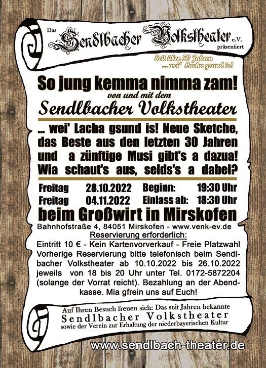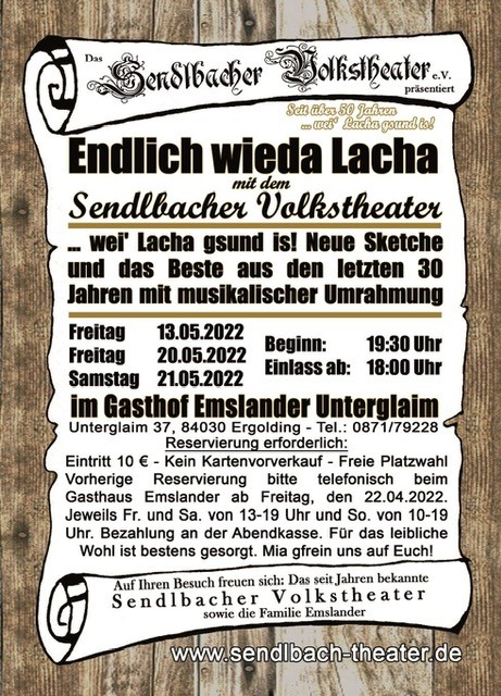Aufgrund der Corona-Pandemie mussten wir unsere Theatersaison im Jahr 2021 abbrechen. Und auch 2022 waren aufgrund der beschränkten Möglichkeiten und der wenig planbaren Entwicklungen keine großen Theateraufführungen möglich. Die „Zeit in der Gesellschaft“ und die „Zeit zum Lacha“ war – zumindest im größeren Rahmen – rar gesät. Deshalb haben wir – sobald es von den Beschränkungen umsetzbar war – Sketcheabende unter dem Motto „Endlich wieder Lacha“ und „So jung kemma nimma zam“ im Mai und Oktober 2022 aufgeführt. Hierbei wurden kleine Witze und Geschichten aus den letzten 30 Jahren unter musikalischer Umrahmung aufgeführt. Unser Ziel war es dabei unseren Zuschauern und treuen Anhängern wieder ein Lachen in ein paar unbeschwerten Stunden zu beschweren. In diese Zeit hat unser Leitgedanke „…wei Lacha gsund is!“ wohl am besten gepasst.